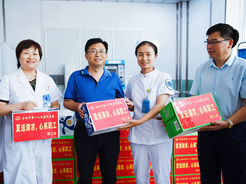 在院本部急诊大厅里,院工会发放牛奶、绿茶、矿泉水防暑降温用品慰问临床一线及加床繁忙科室的职工,纪委书记李博文、工会主席李春林在慰问现场嘱咐医护人员注意休息,劳逸结合,确保医护人员的身心健康和病人安全,并将消暑饮品一一送到职工手中。在场职工深受感动,纷纷表示不辜负领导的关怀,立足岗位,奋战高温,保证各项工作任务顺利完成。