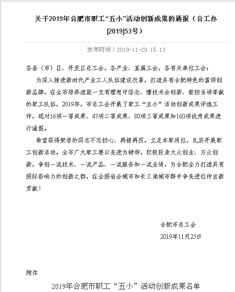 为大力弘扬劳模精神、劳动精神和工匠精神,围绕工作实际关键问题开展的小发明、小创造、小革新、小攻关、小建议,2019年合肥市总工会在全市范围内开展职工“五小”活动创新成果评选工作。