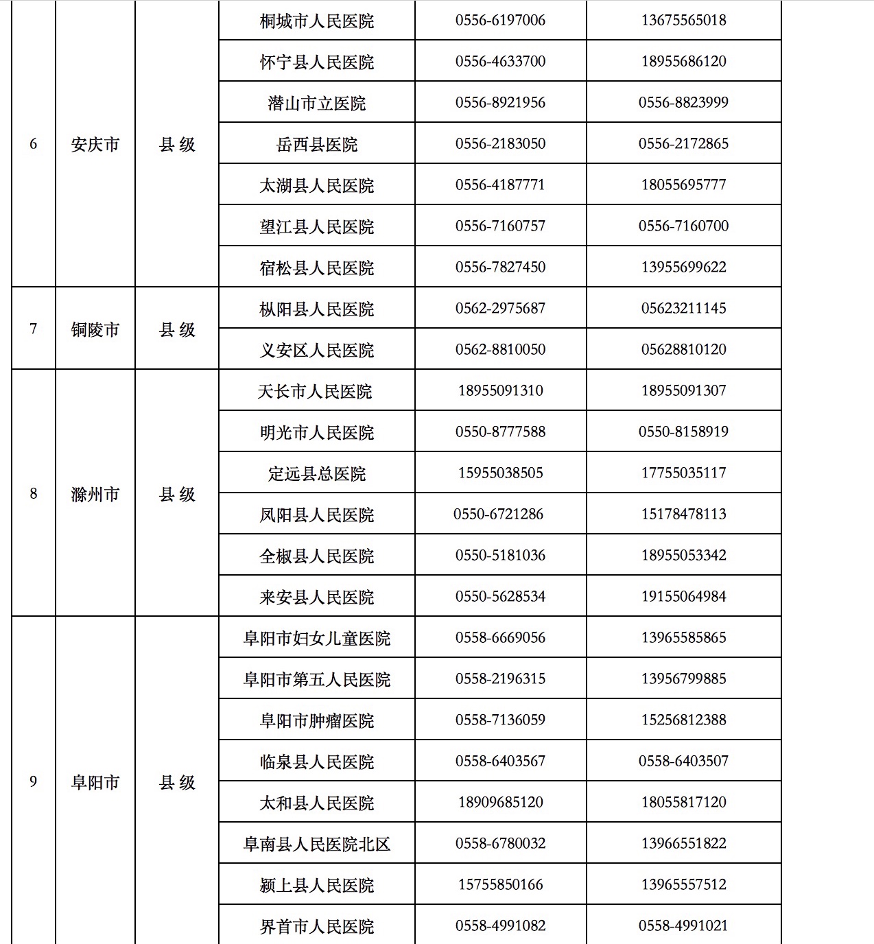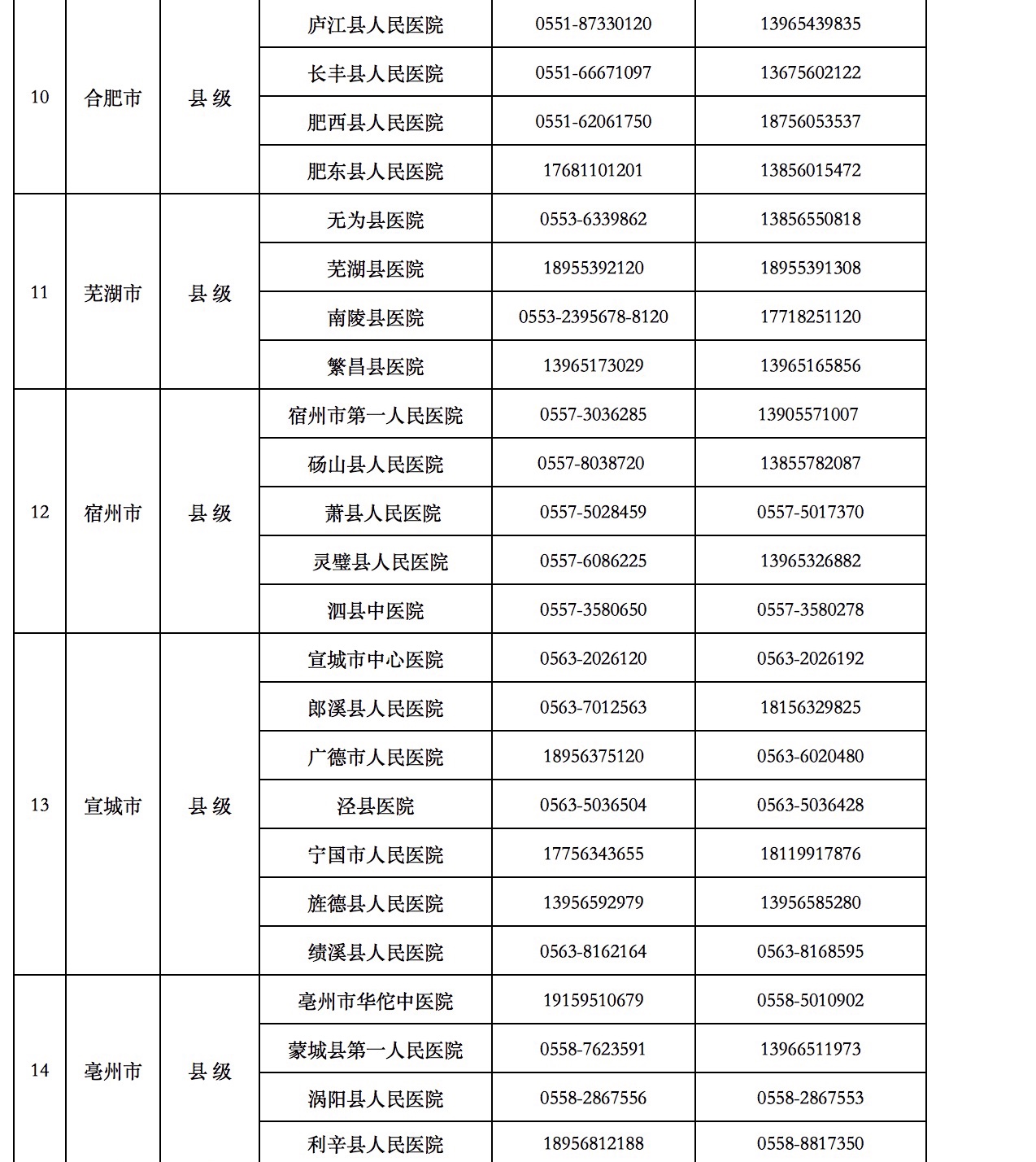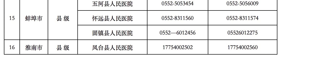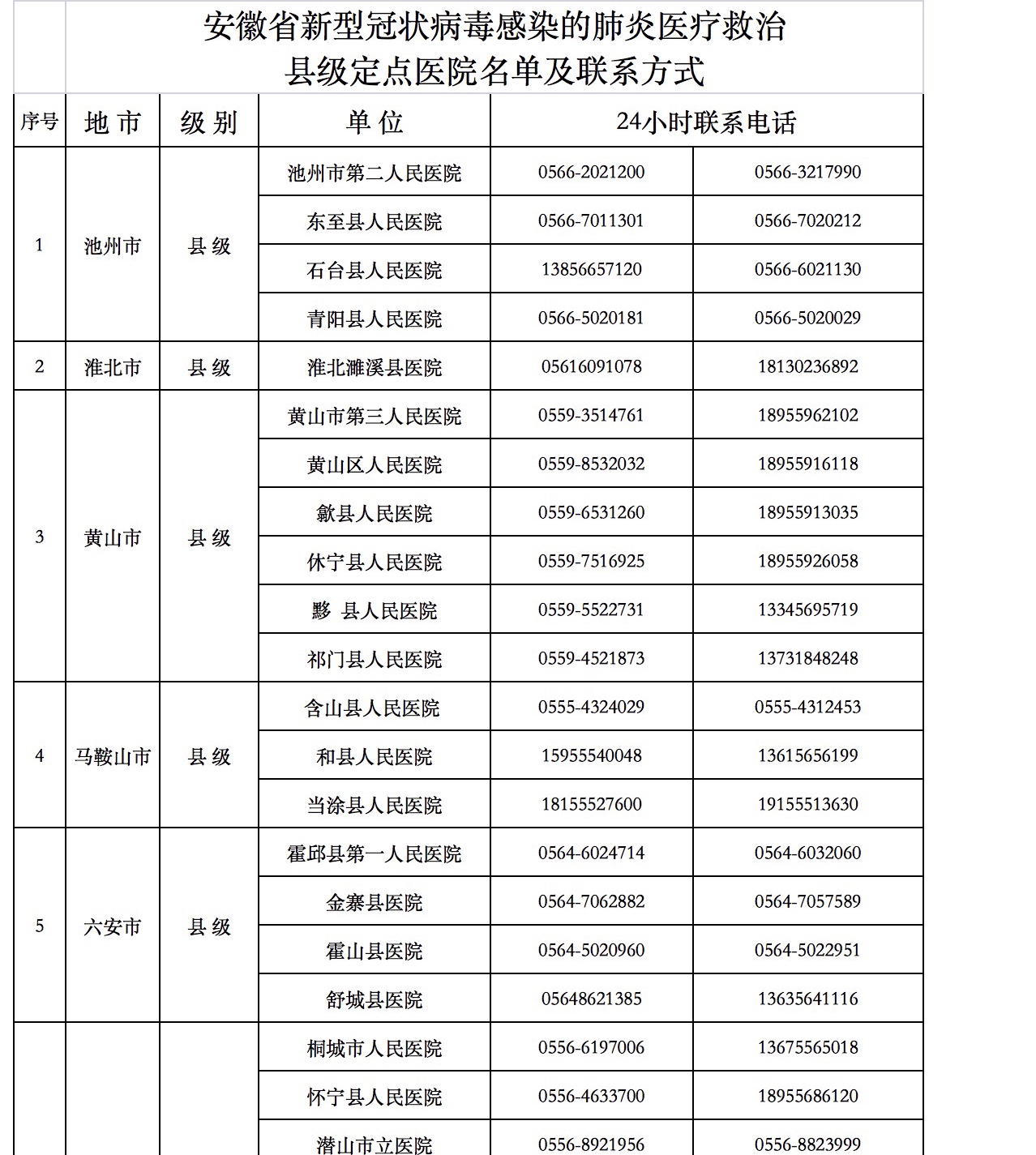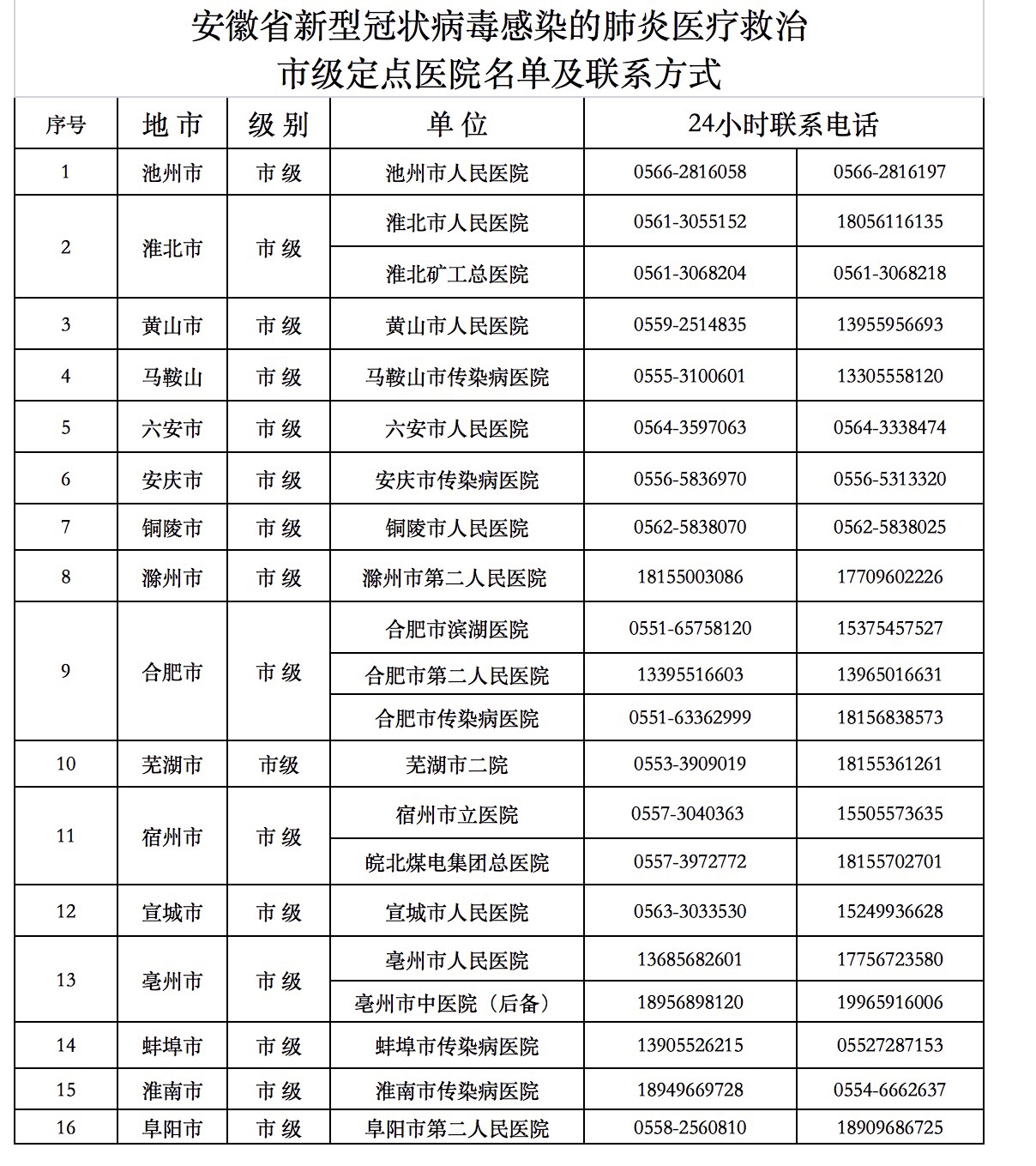 安徽省新型冠状病毒感染的肺炎医疗救治定点医院名单和联系方式
