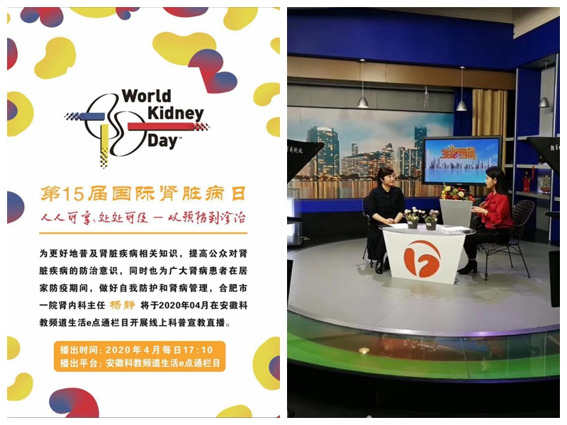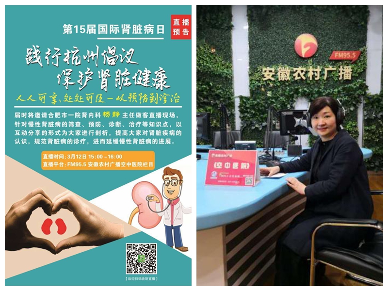 采取广播、电视的形式为大家科普肾脏疾病的相关知识。3月12日杨静主任受邀做客安徽农村广播空中医院栏目组,以网络广播的方式开展“世界肾脏病日”主题活动,以互动形式为大家剖析肾脏疾病知识。另外杨静主任还将做客安徽教育频道快乐e点通栏目,开展为期6期的肾脏知识科普,深入浅出,干货满满,为足不出户的患者及时提供疫情期间诊疗建议和居家指导。