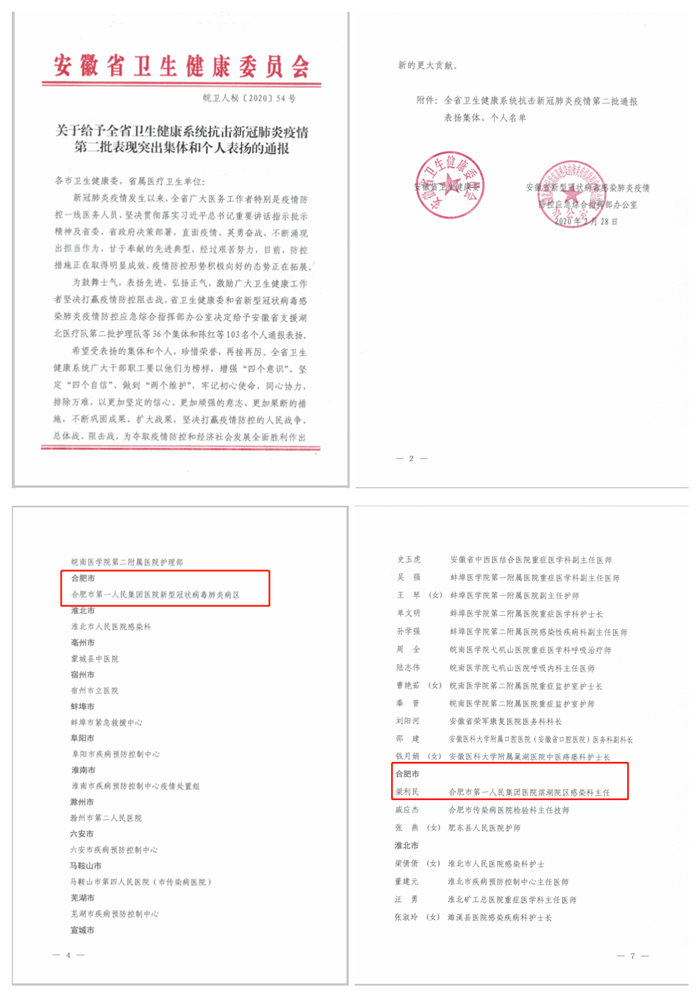 日前,安徽省卫生健康委印发《关于给予全省卫生健康系统抗击新冠肺炎疫情第二批表现突出集体和个人表扬的通报》,全省共计36个集体、103名个人受到通报表扬。合肥市第一人民集团医院新型冠状病毒肺炎病区、集团医院滨湖院区感染科主任梁利民分别作为集体和个人受到通报表扬。