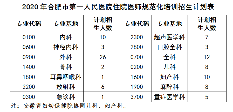 个,分别为:内科、儿科、急诊科、神经内科、全科医学科、外科、骨科、妇产科、耳鼻喉科、麻醉科、重症医学科、放射影像科、超声医学科、口腔全科。协同医院两家—安徽省妇幼保健院(协同专业:妇产科、儿科)、合肥市精神病医院(协同专业:全科),协同单位三家—合肥市庐阳区杏林街道社区卫生服务中心、合肥市包河区烟墩街道社区卫生服务中心、合肥市蜀山区琥珀街道社区卫生服务中心。