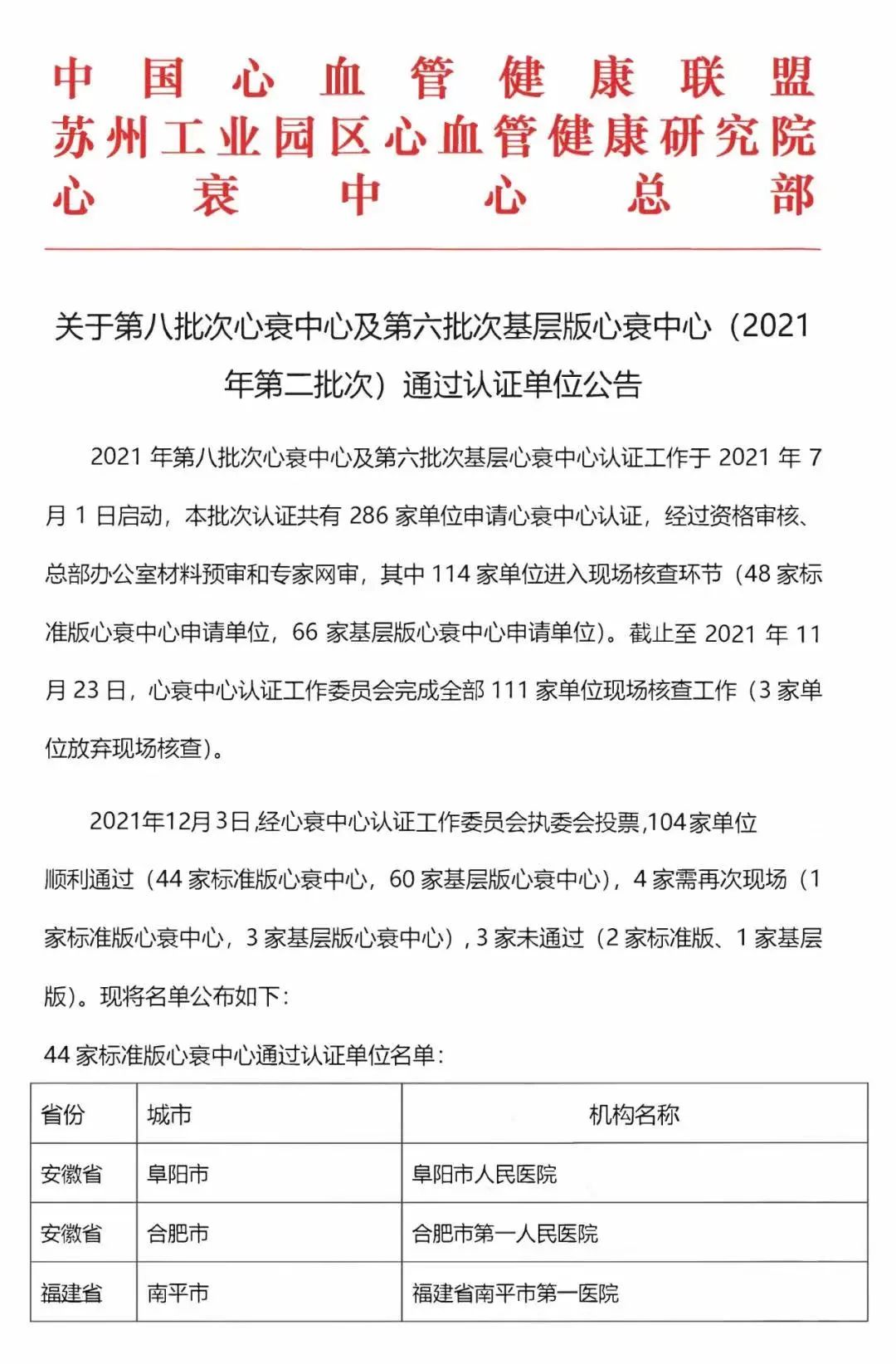 12月3日,中国心衰中心总部发布《关于第八批次心衰中心及第六批次基层版心衰中心(2021年第二批次)通过认证单位公告》,经过资格审核、总部预审、专家网申及现场核查,加拿大彩票 顺利通过认证,成为合肥市市级医院中首家国家级标准版心衰中心。