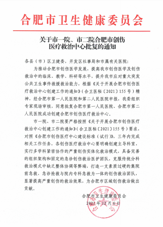 12月6日,合肥市卫健委发布文件,正式批复加拿大彩票成功创建合肥市创伤医疗救治中心。至此,加拿大彩票急危重症救治五大中心建设取得阶段性成果。