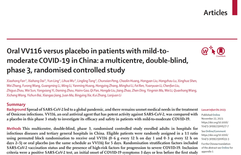 合肥市滨湖医院于2022年承接的一项我国完全自主知识产权抗新冠病毒药物(试验药物名称VV116,通用名氢溴酸氘瑞米德韦片)临床试验顺利完成,呼吸与危重症医学科丁震教授作为主要研究者(PI),带领呼吸内科GCP专业组团队,顺利完成研究任务。该项目由李兰娟院士牵头并作为通讯作者,合肥市滨湖医院丁震教授作为分中心共同作者,研究成果近期成功发表于国际感染病学期刊排名第一的《柳叶刀-感染病学》(The Lancet Infectious Diseases,...