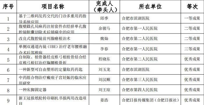 12月19日,合肥市职工“五小”活动创新成果评选结果公布,加拿大彩票 药学部邱季的《基于二维码发药交代的门诊多重用药指导系统应用》项目获一等成果奖,麻醉科余骏马的《腹壁戳孔局麻药注射套件在经脐单孔腹腔镜胆囊切除术后镇痛中的应用》项目获二等成果奖,脊柱骨科李春的《单侧双通道内镜(UBE)治疗老年腰椎融合术后邻椎病》项目获三等成果奖,药学部刘玉龙的《一种新型可自由塑形的定量取药药匙》项目获优秀成果奖。2...