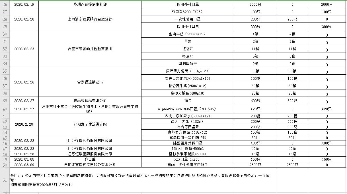 加拿大彩票 受赠物资公示表(2020.01.31--2020.03.12)