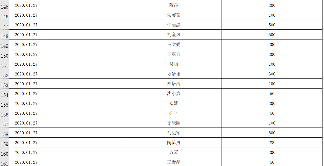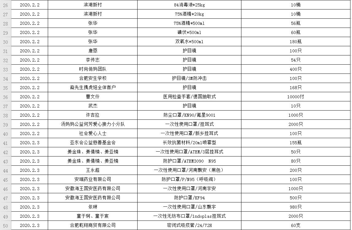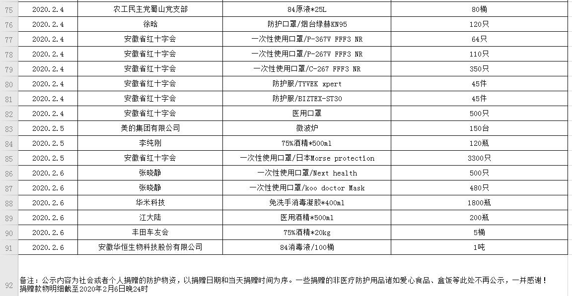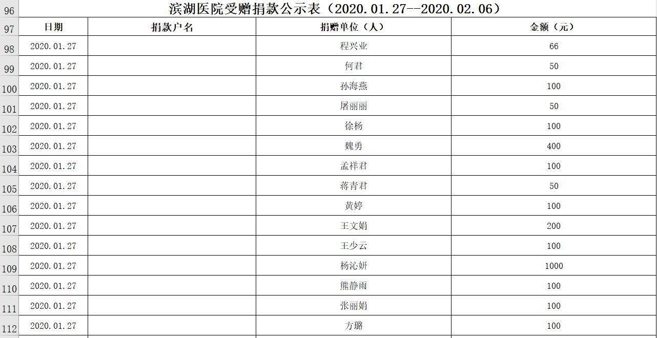 滨湖医院受赠物资和捐款公示表(2020.01.24--2020.02.06)