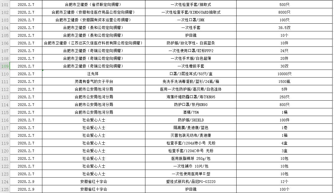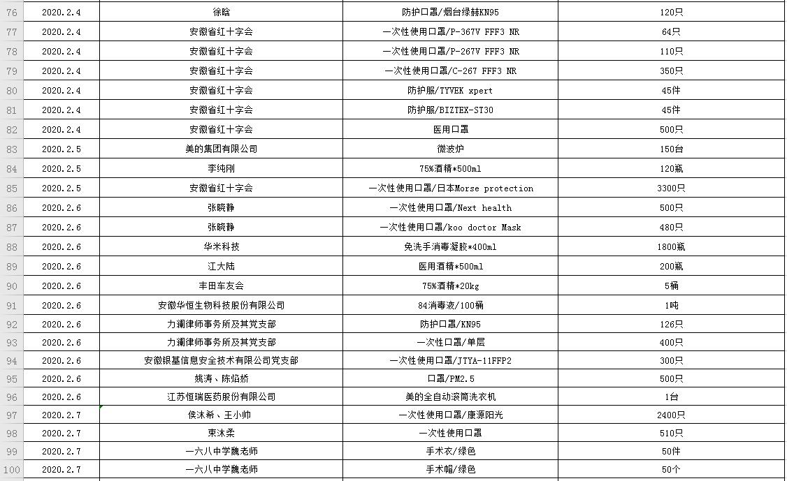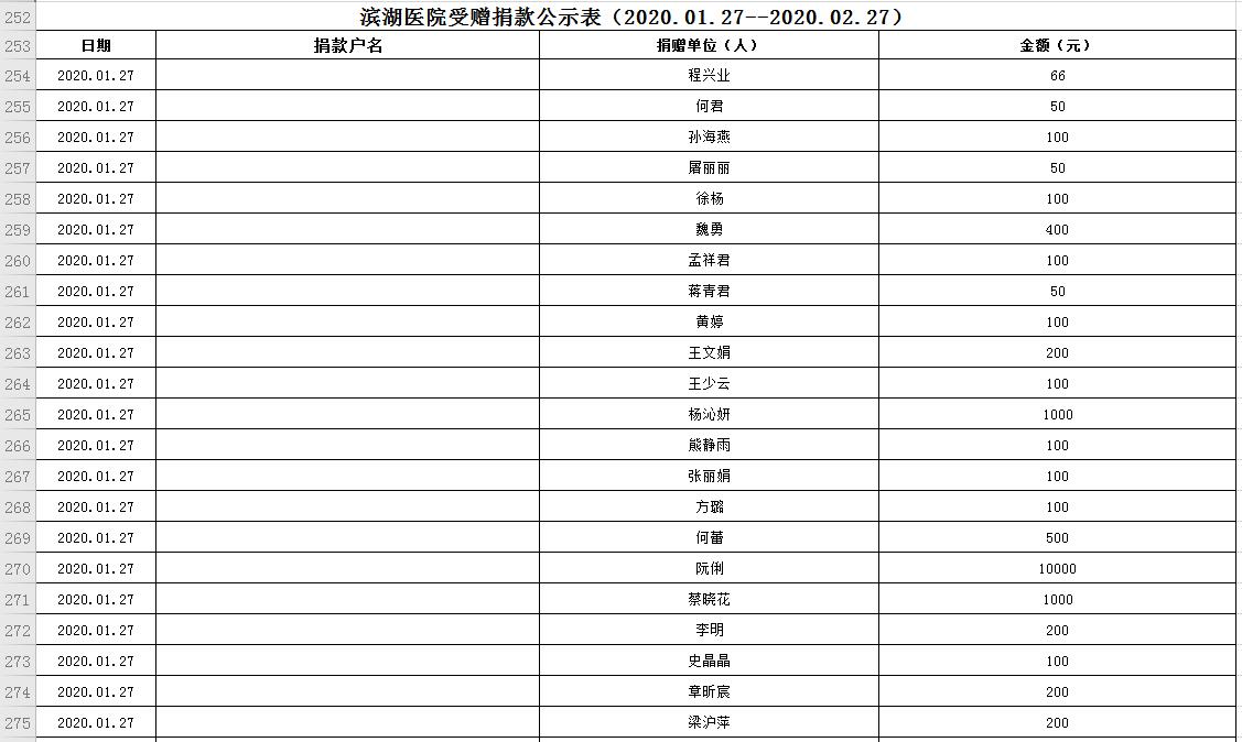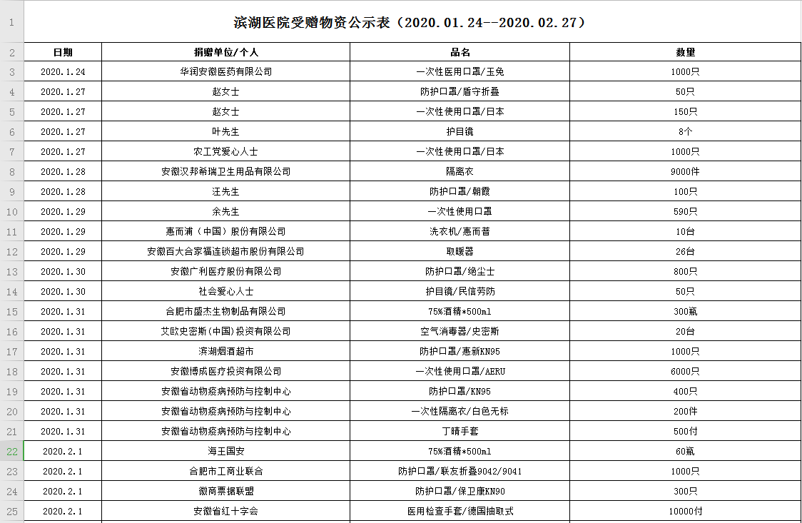 滨湖医院受赠物资公示表(2020.01.24--2020.02.27)