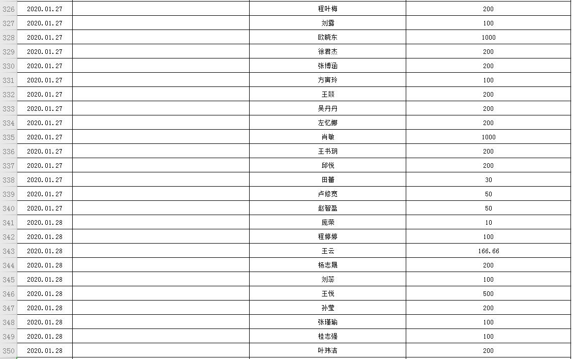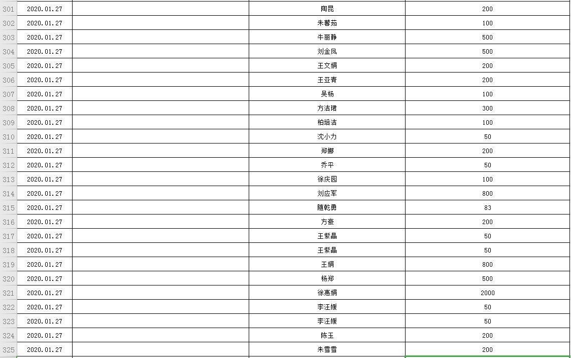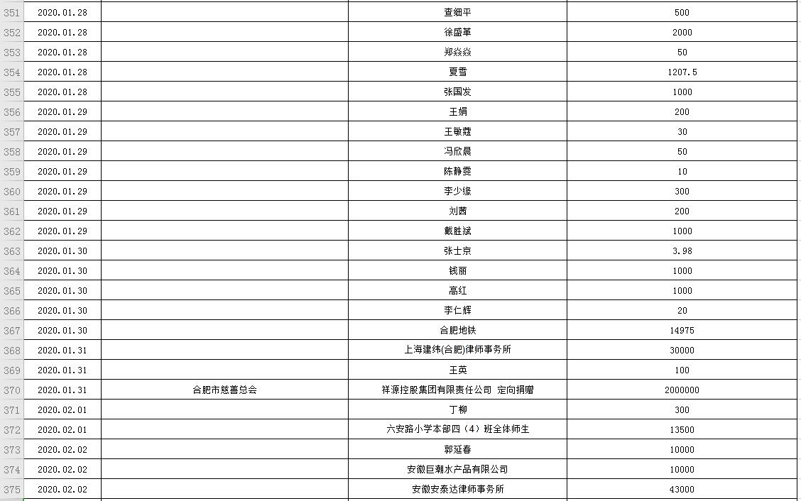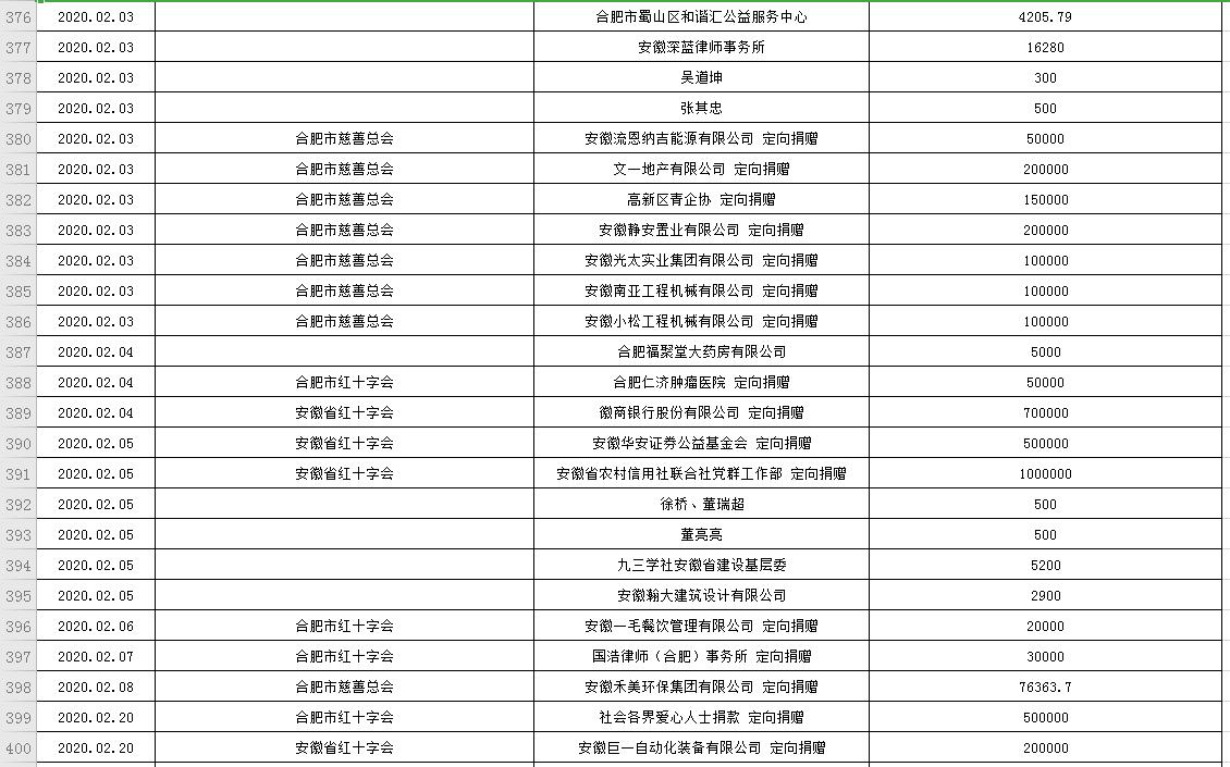 滨湖医院受赠物资公示表(2020.01.24--2020.02.27)