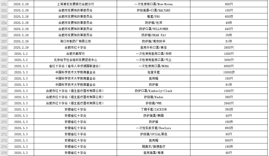 滨湖医院受赠物资公示表(2020.01.24--2020.03.05)