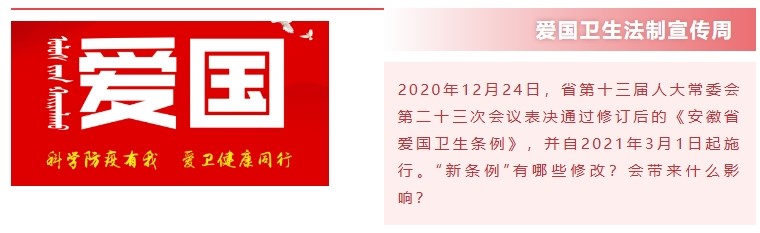 据了解,爱国卫生运动始于1952年,从除“四害”到“五讲四美三热爱”,从卫生城镇创建到厕所革命,爱国卫生运动在我国发展建设的不同时期打下了鲜明的烙印。2006年6月通过的《安徽省爱国卫生条例》,对规范我省爱国卫生工作,改善城乡卫生环境等发挥了重要作用。随着经济社会发展,爱国卫生工作也面临一些新情况、新问题,如:爱国卫生工作体制机制需要进一步健全,公共卫生基础设施建设需要进一步加强,环境污染、食品和饮水安全等突出问题需要进一步采取措施予以治理。