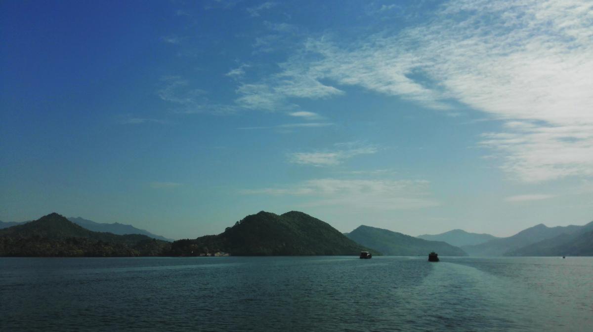 领略了“翡翠”的美,怀着期盼的心情,经过一夜的休整,第二天上午我们来到了此行的第二个目的地——太平湖。太平湖是一处人工湖,总面积88平方公里,是安徽省最大的人工湖。她四周青山环抱,郁郁葱葱,湖水澄碧幽深,水天相接。踏上游船,静立在船头远眺:远处青山似眉黛,湖水碧绿,柔光潋滟。随着游船前行的波纹一圈圈漾开,自己的心仿佛也在慢慢舒展,所有烦恼似乎也跟着远去了。静谧,深呼吸,如此享受着一个人的心灵盛宴。也许只有大自然才有这般神奇的魅力。