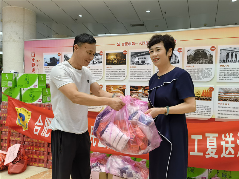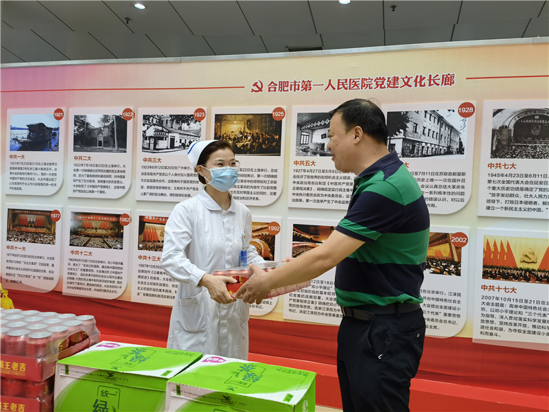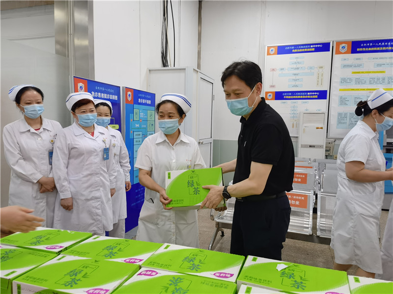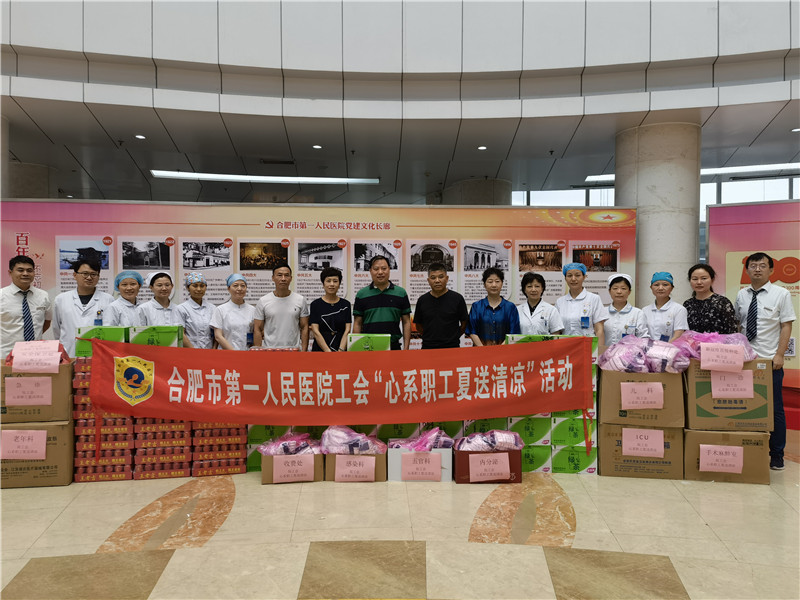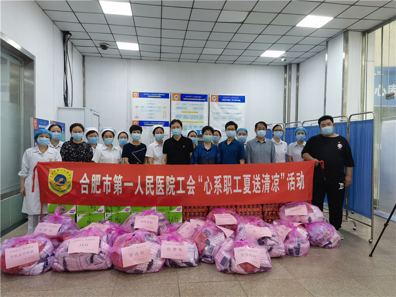 为推动党史学习教育走深走实走心,将学习成果转化为办实事的工作实效。当前正值炎热盛夏,持续的高温也牵动着院领导的心,带着对全院职工的牵挂,7月16日,院工会在本部院区和滨湖院区组织开展“心系职工夏送清凉”活动,院党委书记吴冬雷、院长唐智国、工会主席李春林慰问临床一线加床科室职工,向他们发放了毛巾、香皂、绿茶、王老吉等防暑降温用品,在炎炎夏日送去丝丝凉意,并对职工为医院发展付出的辛勤劳动表示感谢。