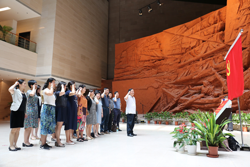 “胜利之师”艺术群雕前重温入党誓词,随后在讲解员的引导下有序进入各展厅参观。渡江战役是中国人民解放军实施战略追击的第一战役,也是向全国进军作战的伟大起点,渡江战役纪念馆珍藏了一千余件历史文物,反映了惊心动魄的渡江场景,幻影成像、半幅画馆结合