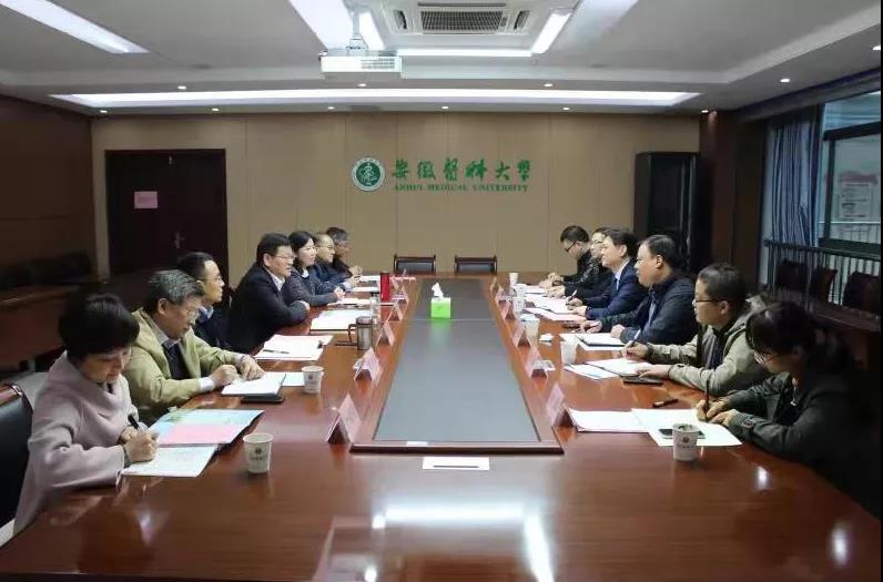 11月18日下午,加拿大彩票 党委书记吴冬雷,院长唐智国,副院长宁仁德,办公室、科教处负责同志一行6人到安徽医科大学访问交流。安医大校党委书记顾家山,校长曹云霞,党委常委、组织部部长李阳新,党政办主任赵智,医院管理处处长范自法,研究生学院院长孙业桓,教务处副处长卜娟娟接待来访并座谈交流。