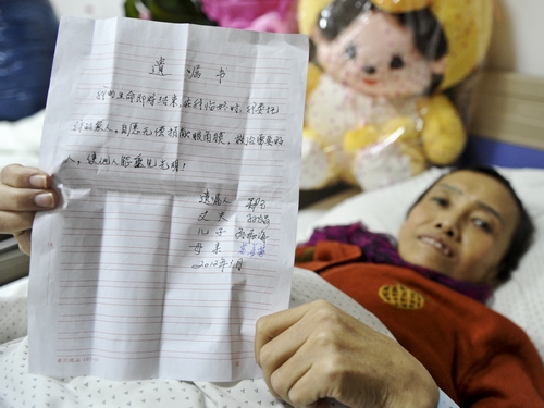 “我的心愿快达成了,非常高兴。”躺在病床上的郑玉看着丈夫孙忠昌代她在志愿者捐献眼角膜申请登记表上签字并按下手印,心情有些激动。