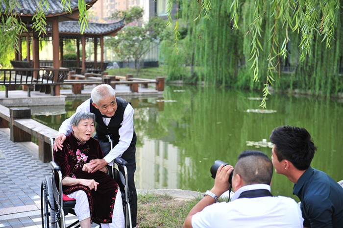 “奶奶,你靠爷爷近一点,头侧过来一点,二位笑一笑!”“好,自然些。”在摄影师的指点下,“咔嚓、咔嚓”快门一次次按下,闪光灯一次次亮起。在两位老人暖暖的笑容中,时间仿佛在此刻定格了。