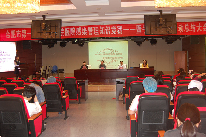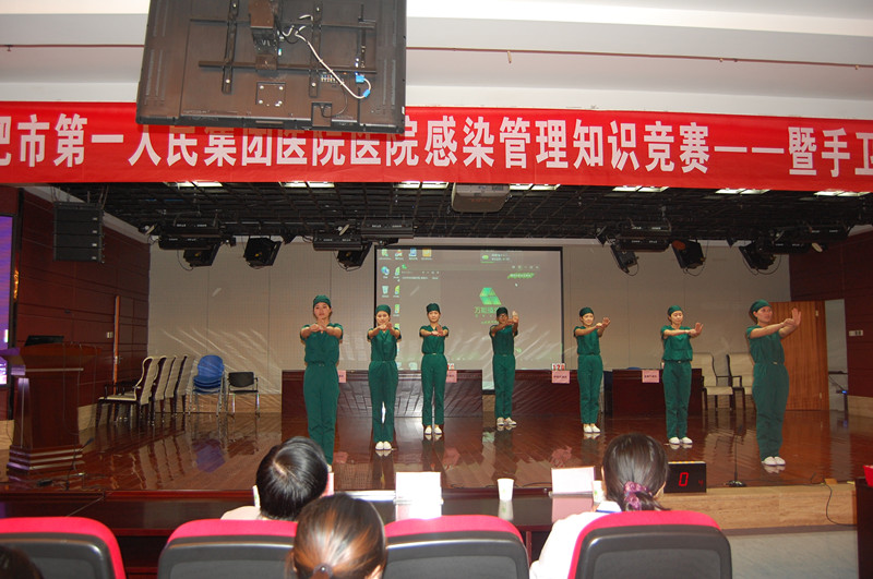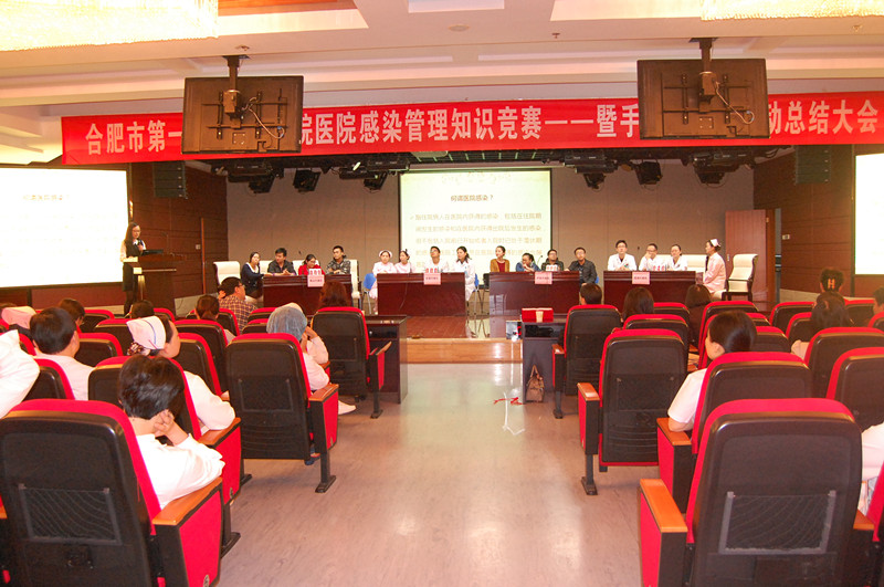 下午,医院感染管理知识竞赛——暨手卫生系列活动总结大会与在滨湖医院医技楼16楼大礼堂举行。作为手卫生系列活动之一,也是今年手卫生活动的收官之作,医护人员斗志昂扬,参赛选手由本部、滨湖、蜀山、庐阳四个院区分别推选4名优秀选手进入知识问答环节,来自集团内医务人员近200人到现场观看比赛,于书记、阚院长、牛院长亲临比赛现场为选手加油助威。比赛经过稳中求胜的必答环节和紧张刺激的抢答环节,经过激烈角逐,院感知识竞赛优秀代表队奖被庐阳分院夺得。比赛结束,医院感染管理科把爱萍对本次手卫生系列活动作了全面生动的总结,院领导为获奖选手和优秀代表队颁发了奖品和证书,以资鼓励。最后,手术室护士带来的生动活泼的《洗手舞》表演得到了全场热烈的掌声。2015年度集团内手卫生系列活动在热烈的气氛中落下帷幕,活动取得圆满成功。