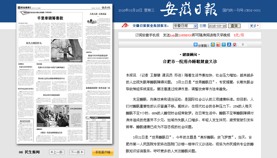 世界卫生组织调查,27%的人有睡眠问题。为唤起全民对睡眠重要性的认识,国际精神卫生组织主办的全球睡眠和健康计划于2001年发起了一项全球性的活动――将每年的3月21日,即春季的第一天定为“世界睡眠日”。2016年世界睡眠日是3月21日,星期一,中国的主题是:健康心理良好睡眠。人一生中有三分之一的时间是在睡眠中度过,五天不睡眠人就会死去,可见睡眠是人的生理需要。睡眠是一个复杂的生理过程,也是人的生命不可或缺的生理过程,睡眠的好坏与人们的健康密切相关,睡眠障碍是很多疾病的重要诱发因素,大量研究与临床实践都证明,睡眠障碍与人的心理障碍、精神疾病互为因果。睡眠不仅是影响人们身心健康、家庭幸福、社会和谐的医学问题,也是一个社会问题。有数据显示,美国每年有10万交通事故与睡眠障碍有关,睡眠障碍有关的医疗代价高达160亿。另据两位美国学者对7000人为期5年的研究表明,在影响人体寿命的7种因素中,睡眠是重要的一项,由此可见睡眠的重要性。