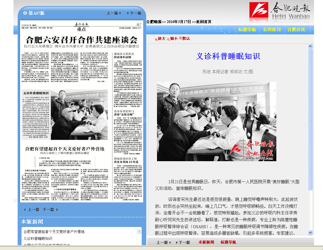 宋先生最近总是感觉很疲惫,晚上睡觉呼噜声特别大,此起彼伏的,时而也会突然坐起来,喘上几口气,才感觉呼吸顺畅些。白天工作没精打采,坐着开会不一会就睡着了,感觉特别尴尬。参加义诊的呼吸内科主任李秀耐心听完宋先生的讲述后,解释道,打鼾也是一种疾病,专业上称为阻塞性睡眠呼吸暂停综合征(OSAHS),是一种常见的睡眠呼吸调节障碍性疾病。在睡眠过程中出现呼吸暂停,容易造成多器官缺氧,引起多系统损害。专家建议,对于确诊患有鼾症的病人,在日常生活中应保持良好的生活习惯,减轻体重,戒烟酒,睡觉时可采取侧卧位睡姿,注意预防和及时治疗鼻腔阻塞性疾病。若病情比较严重,一种情况是由于鼻部、咽喉部疾患等导致的鼾症患者,建议外科手术治疗。另一种,非器官发育异常的患者可使用便携式无创呼吸机治疗,可以改善患者睡眠质量。