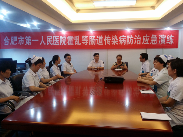 演练模拟一个患者出差外地并进食海鲜后出现水样腹泻10余次伴呕吐来市一院就诊,预检分诊护士通过询问病史后发现患者症状高度疑似霍乱,立即电话通知肠道门诊,同时做好个人防护后将病人送达肠道门诊,随后对平车和分诊台进行了终末消毒。肠道门诊医生通过询问病史、查体,大便培养初步判定患者为疑似霍乱,给予病人隔离观察和必要的治疗同时立即电话向总值班汇报,总值班向值班院长、医务部及防保科报告,医务部接到汇报后随即组织相关专家会诊,防保科向疾控中心汇报,同时做好院感消毒处理。