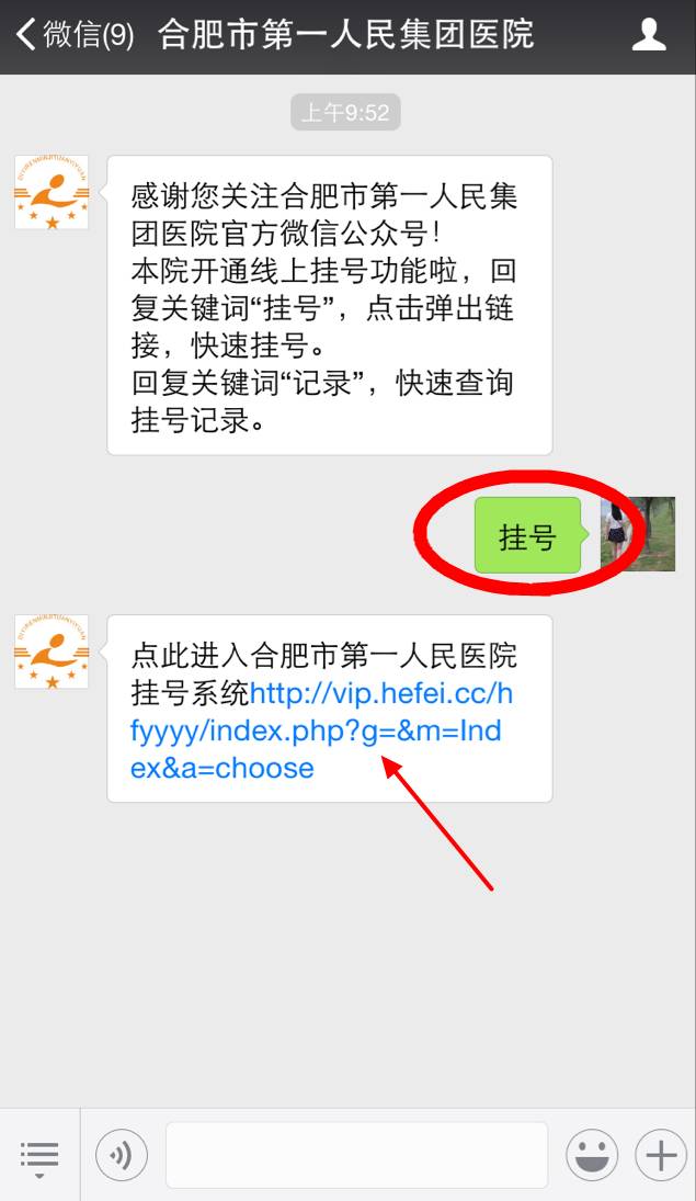 扫描二维码进入微信公众号合肥市第一人民集团医院,回复“挂号”,即可快速进入微信预约挂号系统,或者点击左下角菜单栏“预约咨询”→“预约挂号”