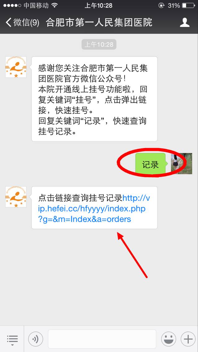 进入微信公众号:合肥市第一人民集团医院,回复“记录”,即可快速查询个人挂号记录,或点击右上角小图标,一键查询个人挂号记录。