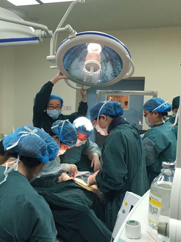 在合肥市滨湖医院外科楼17楼产科,正在进行合肥市首例腹主动脉球囊阻断术+子宫下段剖宫产的手术,因为产妇胎盘血管复杂、异常、弯曲,需要辅助介入手术减少出血量,手术难度大,需要不停地调整无影灯的位置,保持手术视野的清晰。手术室巡回护士温芳双手托起不止1米8高的无影灯,坚持了4小时,直至手术完成。此时,她已双臂麻木满头大汗。(吴宝玉 摄)