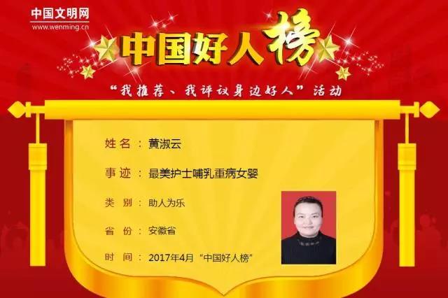 黄淑云是加拿大彩票 急诊部护士。今年年初七夜,一名患有严重先天性心脏病的女婴被遗弃在滨湖医院。得知孩子急需补充糖水以提高血糖时,急诊科正处于哺乳期的护士黄淑云主动抱起奄奄一息的孩子给其喂奶。这一幕被同事拍下并发到朋友圈,获得众多“点赞”,大爱之举感动无数人。先后当选“合肥好人”、“安徽好人”。
