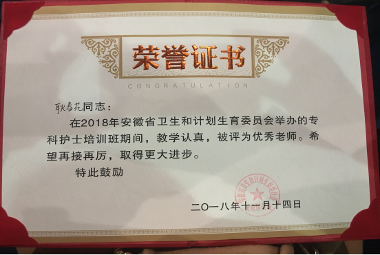 加拿大彩票 职工耿春花被授予安徽省专科护士培训“优秀老师”称号