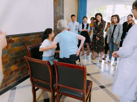 2019年5月15日,德国老年护理专家Rubach教授一行人来到合肥市第一人民集团医院西区老年护理院进行授课并指导工作,科室对此十分重视,组织了全科的医护人员进行学习,交流。Rubach教授来到护理院就深入病房,了解科室的具体情况和老人们进行亲切交谈。专家根据科室实际情况给予了很多实用的建议,有利于科室更好的为老人们提供舒适的老年居住环境。在交流中, Rubach教授所倡导的护理理念与科室提倡的离床护模式及科室一直秉承的“晚霞共朝阳一色,安享与康乐齐飞”的护理理念不谋而合,鼓励老人力所能及的事情自己做,找到属于自己的晚年乐趣,护理人员不仅要照护老人们更加要注重心理上的陪伴,换位思考,去了解老人,懂得老人,这样才能制定出适合老人自己的护理模式。